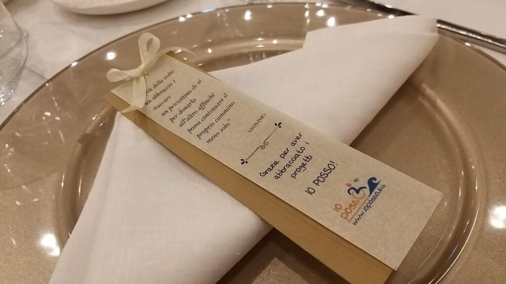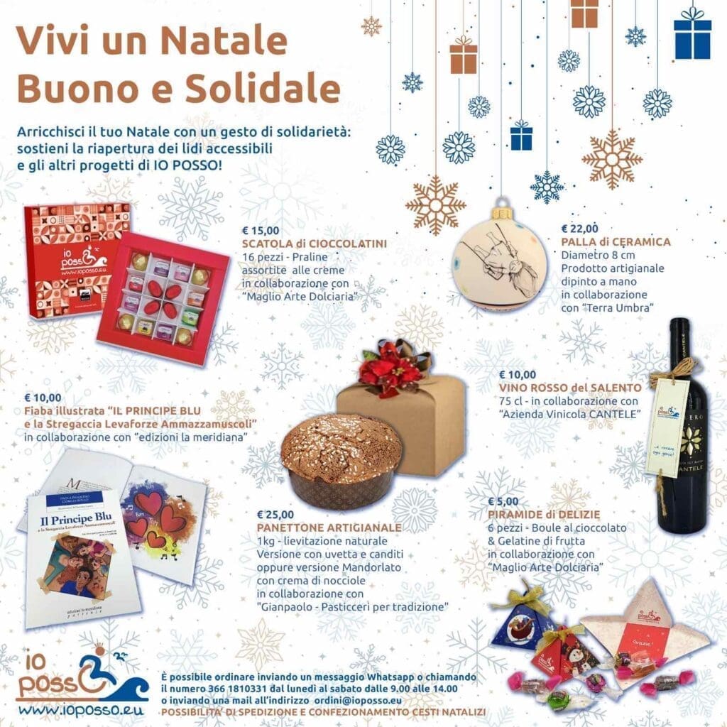 Durante l’evento i volontari IO POSSO saranno presenti con uno stand con i diversi gadget del progetto, tra cui le novità del Natale 2023: la decorazione in ceramica interamente dipinta a mano sul tema 2023 “Momenti di leggerezza” realizzata artigianalmente da Margherita Nardi – Terra Umbra, la scatola di cioccolatini e la piramide di delizie (in collaborazione con Maglio Arte Dolciaria), il panettone artigianale (in collaborazione con Gianpaolo – Pasticceri per tradizione), il vino rosso del Salento (in collaborazione con azienda vinicola Cantele), anche questo un modo gustoso e bello per sostenere IO POSSO.