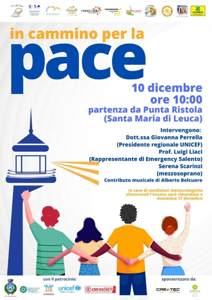 “In cammino per la pace” è un progetto, patrocinato da: Comune di Castrignano del Capo, Unicef Regione Puglia, Emergency Salento, CSV Brindisi Lecce Volontariato nel Salento ETS, Pari Opportunità della Provincia di Lecce, e promosso da una rete di associazioni che operano sul territorio. L’intento è quello di testimoniare la volontà di pace, in un periodo storico di grande disorientamento e angoscia in cui le guerre e i conflitti armati sono tornati a flagellare il mondo.